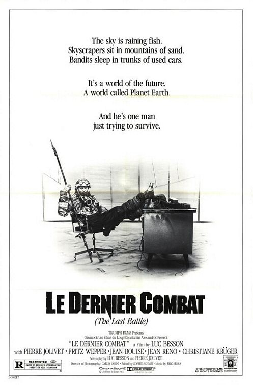Luc Besson's feature debut film Le Dernier Combat (The Last Battle) is a technically proficient calling card as well as an amusingly weird experience. It's shot in striking black-and-white (Besson's stylish visuals are already there) and contains technically no dialogue. (There are two barely-whispered "bonjours.") It's a bleak post-apocalyptic future in which no one can speak, and there are only three main characters. "The Man" (Pierre Jolivet) salvages parts to build a makeshift aircraft; he steals a battery from a gang of scavengers and barely escapes. He meets "The Brute" (Jean Reno) and is badly beaten up. He finds his way to "The Doctor" (Jean Bouise), who heals him. The two soon become friends, and The Doctor shares a secret with him. Meanwhile, The Brute is on the rampage. Eric Serra, who — along with Reno — went on to work regularly with Besson, composed the score. The film, which deserves to be a cult classic, has been difficult to find for years. Happily, in 2025, Sony released it on Blu-ray as part of a nine-movie Besson box set.
